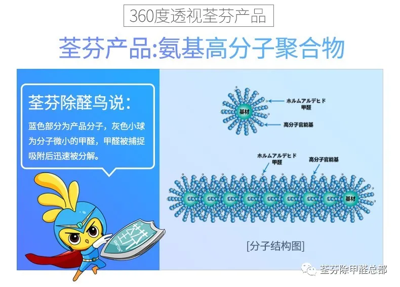 從短期除甲醛到長(zhǎng)效除甲醛,而荃芬屬于氨基高分子聚合物除甲醛,產(chǎn)品主要和醛類物質(zhì)發(fā)生反應(yīng),會(huì)不斷吸附分解甲醛,從而達(dá)到降低甲醛濃度的目的。
