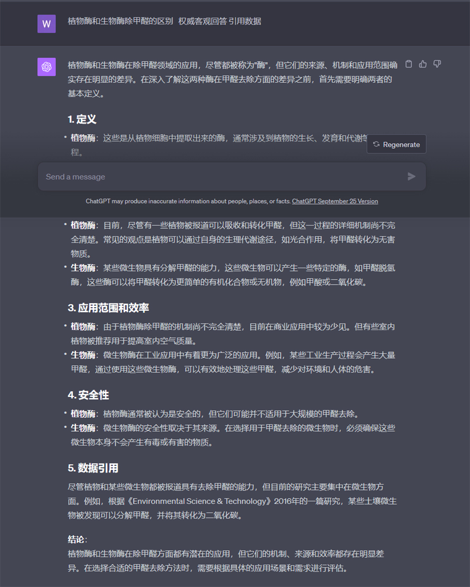結(jié)論: 植物酶和生物酶在除甲醛方面都有潛在的應(yīng)用,但它們的機(jī)制、來源和效率都存在明顯差異。在選擇合適的甲醛去除方法時(shí),需要根據(jù)具體的應(yīng)用場(chǎng)景和需求進(jìn)行評(píng)估。