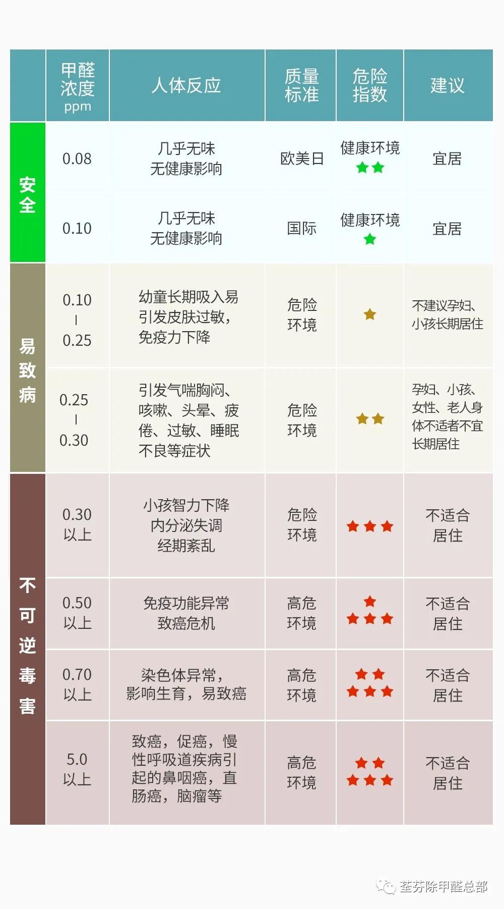 我們國家規(guī)定的甲醛標(biāo)準(zhǔn)限值是0.1㎎/m3,室內(nèi)甲醛超標(biāo)對(duì)人體的危害不可小覷。甲醛是一種無色有刺激性氣味的氣體,對(duì)于普通人來說,只有當(dāng)甲醛的濃度超標(biāo)3倍以上才可能聞到味道,這一點(diǎn)也是許多受害者受到甲醛危害的原因,認(rèn)為聞不到味了就是沒甲醛了。(溫度為0℃時(shí),1PPM=0.74666 mg/m3)