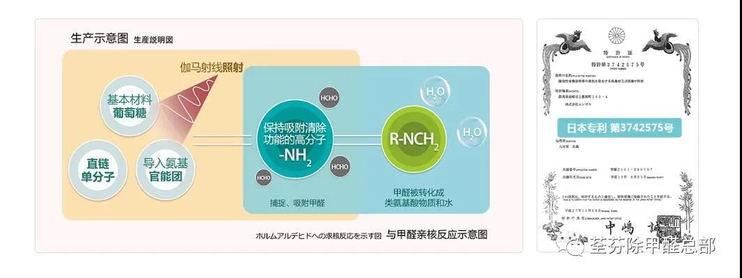 荃芬GRAFTON長效除醛劑因采用放射線照射生成的聚合高性能高分子反應(yīng)技術(shù)而取得日本國專利(專利第3742575號(hào))。