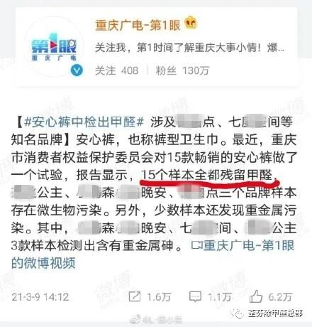 3月9日媒體報道,重慶市消費者權(quán)益保護委員會對15款暢銷的安心褲——幾乎包含女性們所用的所有衛(wèi)生巾大品牌,如七D空間、護S寶等、ABX,——做了一個試驗,報告顯示,15個樣本全部殘留甲醛。引發(fā)許多網(wǎng)友的恐慌。很多安心褲品牌不得不出來發(fā)表聲明:甲醛是有的,但是是符合國家標準的。